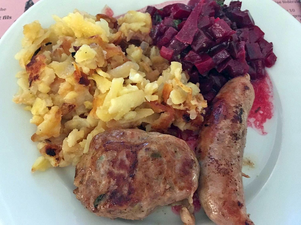 Grillades, röstis, salade de racines rouges